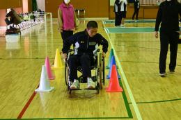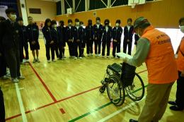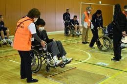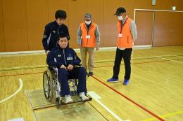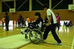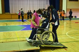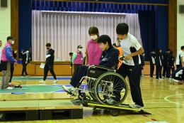 始めに車椅子体験です。乗るのも押すのも初めての生徒がほとんどでした。段差や坂道を越えていくことの難しさがわかりました。