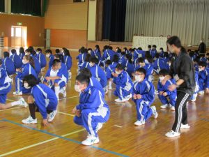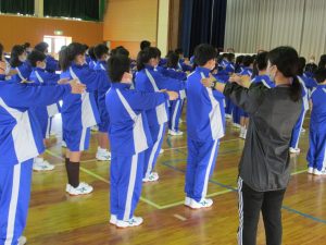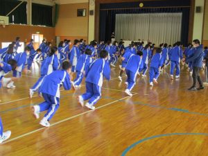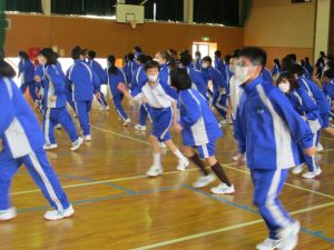 体育科の櫻井先生のユーモラスな指導で、生徒たちはうれしそうに動いていました。
