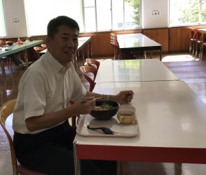 お弁当やテイクアウト商品は教室で食べるルールなので、カフェテリア利用者が食べているメニューは麺類。日替わりメニューの麺類、今日はカレーうどんorカレーそば。「カレーがはねて制服につくからやぁ~めた」という生徒もいれば、楽しみにしている生徒もいます。人それぞれですね。そんな中で人一倍嬉しそうにカレーうどんをすすっていたのは吉田校長先生!午前中に出張があったそうですが、カレーうどんが楽しみでいったん学校に戻ったとのこと。午後はまた別の出張にお出かけでした。