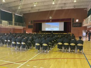 体育館でのガイダンスでは、教務・進路の両主任から、今後の学校生活や将来の歩み方について大切なお話がありました。生徒には「1年生の手引き」を配布しています。ガイダンスの内容が詳しく記載されていますので、保護者の皆様もぜひお子様と一緒にご一読ください。
