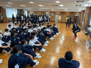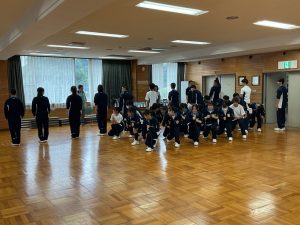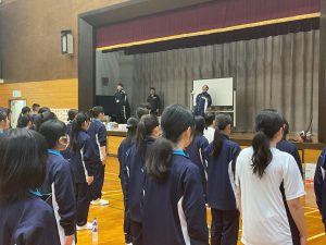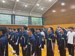午前中のメニューは、校訓唱和、集団行動の練習です。 昨日は先生のあとに続いて行っていた校訓唱和も、本日は生徒が主役。代表生徒の力強い声に合わせ、全員で唱和する姿には自分たちの手で学校生活を作っていく、そんな意気込みが伝わってきました。